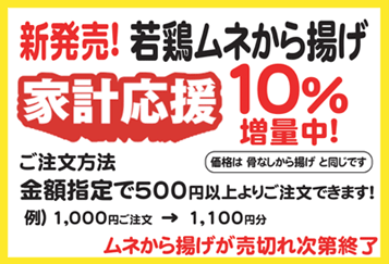販売する際は、家計応援キャンペーンとして「ムネから揚げ」に限り